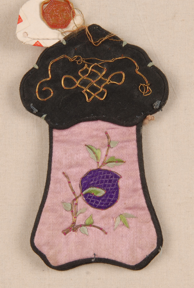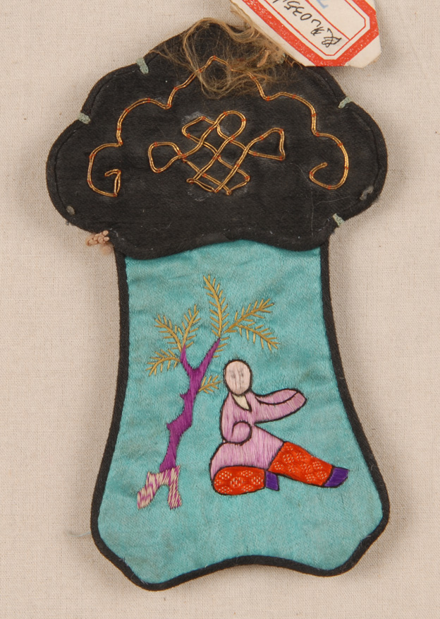 描述:該繡品為一香袋。主體面料為藍色緞,其上鋪絨繡花樹人物紋樣。此外,輔以釘金繡等點綴。周圍鑲黑色素緞為邊。