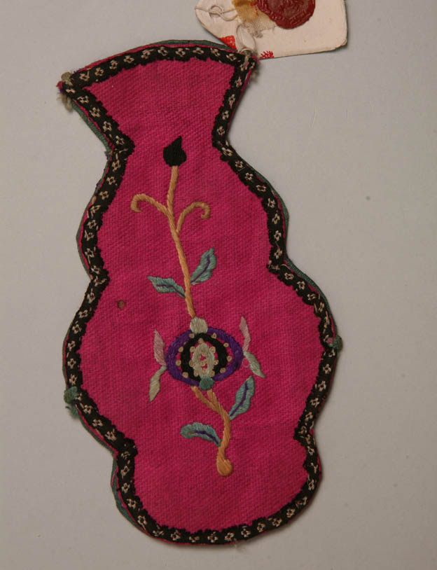 描述:該繡品為一煙絲袋,瓶形。主體面料為綠色綢。其上彩繡花卉。針法包括套針、滾針、打籽等。