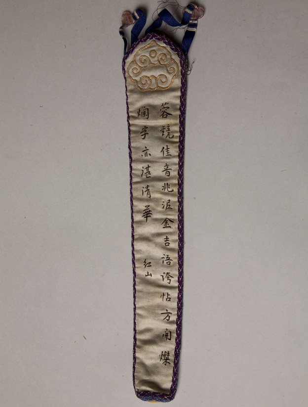 描述:該繡品為一扇套。主體面料采用玫紅緞。其上彩繡玉蘭花鳥紋樣。以鋪絨繡為主,輔以釘金繡等。扇套周圍鑲黃紫色相間的小絳帶。