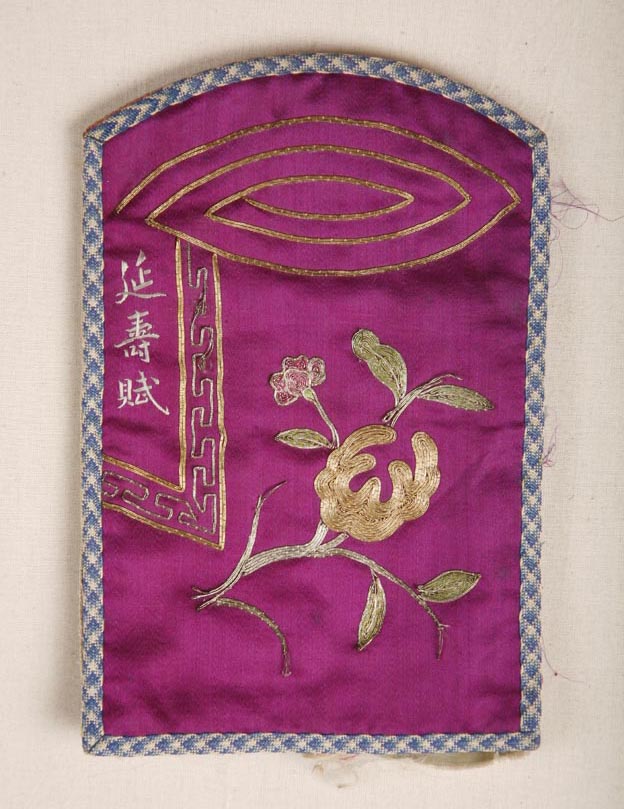 該繡品為一名信夾。主體面料為玫紅色素緞。其上平金繡花卉紋樣,并繡“延壽賦”三字。名信夾周圍鑲藍(lán)黃色相間的小絳帶花邊。