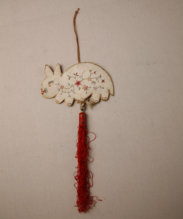 描述:該掛飾呈兔形。主體面料采用白色素緞。其上彩繡折枝桃花。針法以套針為主,輔以釘金繡等。下垂紅色絲質(zhì)流蘇。