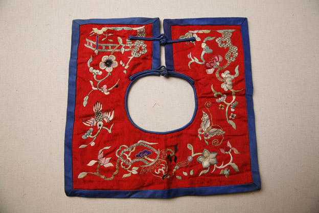 描述:該口圍,方形。紅綢地,上彩繡小橋流水,蝶舞花叢等春意濃濃場(chǎng)景。針?lè)ㄒ云结槥橹?,輔以網(wǎng)繡、釘金繡等。外鑲藍(lán)色素緞邊。