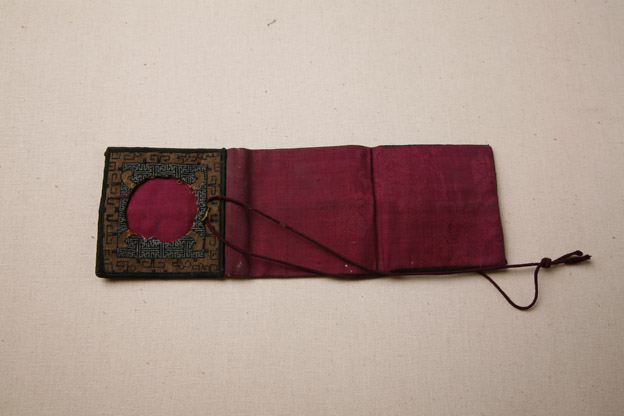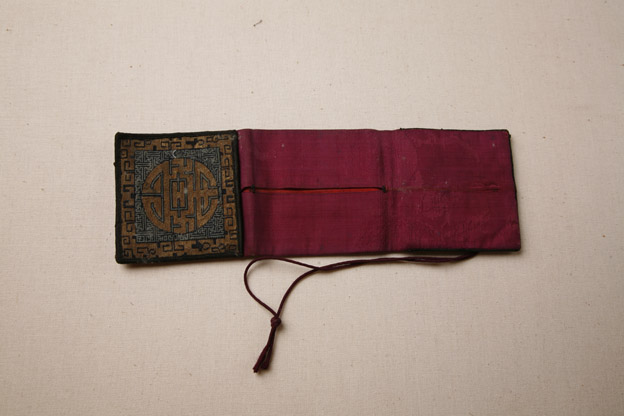描述:該織品為一掛在腰間的褡褳, 兩端各成一個袋子。其上袋子在綠色曲水地上織有一金團(tuán)壽字,其下袋子在綠色曲水地上顯一綢料圓形。上釘一細(xì)長帶子。