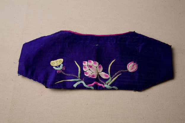 描述:該繡品為一腰包。主要面料采用紫色緞,其上彩繡嬰戲花蝶紋樣。所用針法以套針為主,輔以打籽等。
