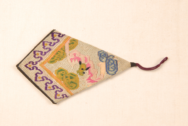 描述: 此為一鑰匙袋,以白色紗織物為帝,一端有系繩,其上用彩色絲線以納紗繡的技法繡出蝙蝠紋樣,寓意吉祥。