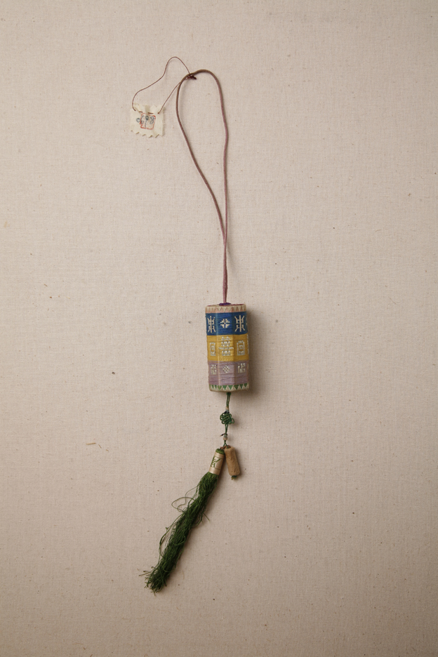 描述:此牙簽筒為正八棱柱形,外表編繡藍、黃、紫三段彩條,每段,每面繡有喜字等紋樣,下綴盤結(jié)和穗子(缺失一只)。