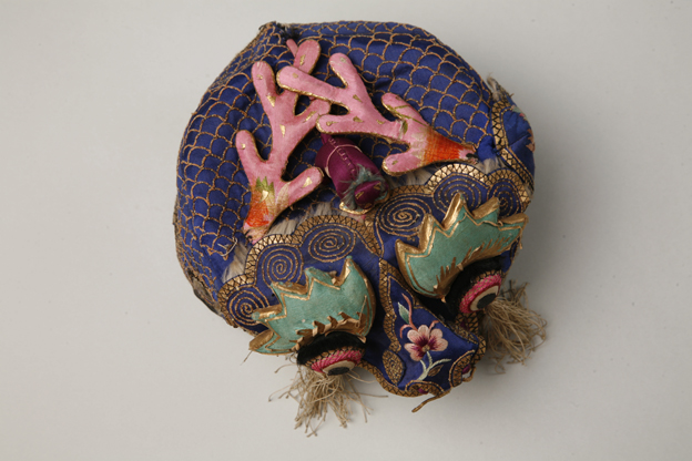 描述:此件為兒童常用的虎頭帽,以寶藍(lán)色緞為面料,用高繡做出龍角、耳、眼眉,用金線繡出龍鱗,形象十分逼真。