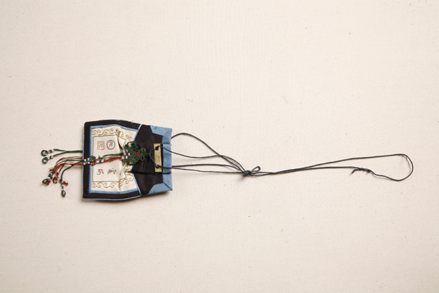 白緞輯線繡地景煙荷包