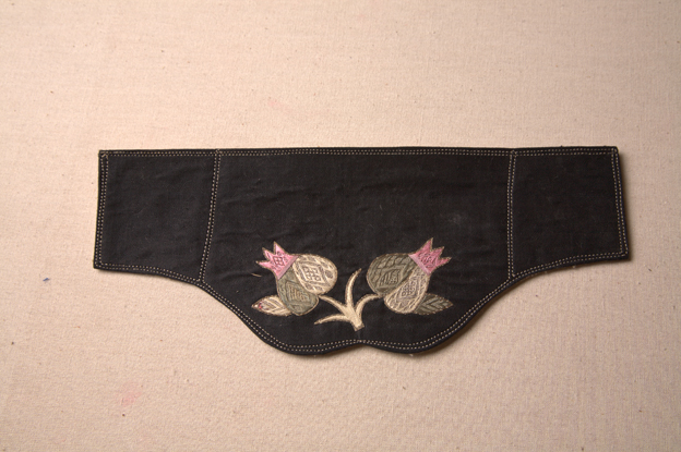 描述:此件腰包在使用時(shí)系于腰間,以黑色素緞為主要面料,其上用彩色絲線以鋪絨繡的技法繡出石榴紋樣。