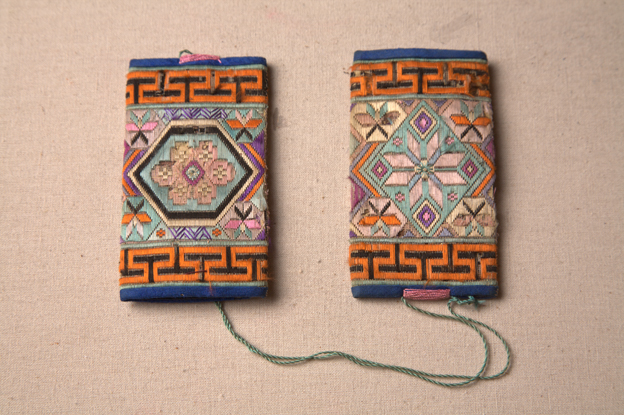 描述:這對火鐮袋為長方形,表面用納紗繡的方法彩繡菱形框架,框架內(nèi)繡有幾何形花紋,上下繡有梯形紋邊飾,色彩搭配自然諧調(diào)。