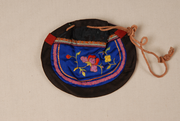 描述:此荷包橢圓形,寶藍緞底,黑色鑲邊,中心鋪絨彩繡花卉紋。