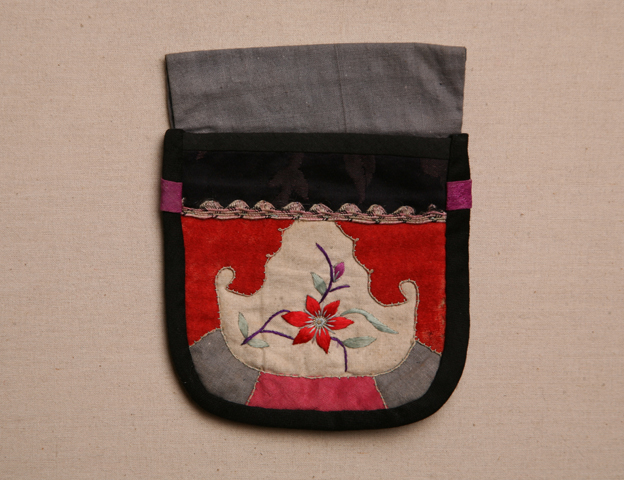 描述:此錢袋使用時系于腰間,外觀呈方形,下端兩角略圓,中心位置為一白色棉布,其上彩繡以桃花紋樣,四周則拼縫以紅、灰兩色素絹,以黑色素緞鑲邊。
