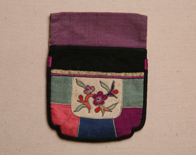 描述:此件錢(qián)袋外觀呈方形,使用時(shí)系于腰間,以桃紅、白、綠、藍(lán)、橙等各色素絹拼縫而成,其中在白色絹地上用彩色絲線繡出梅花紋樣,并用捻金線勾邊,外圈則使用了黑色素緞鑲邊裝飾。