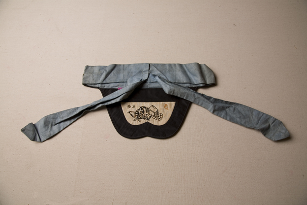 描述:該繡品為一腰包。中央白色綢料上用黑色絲線繡桃子圍棋紋樣。白綢周圍鑲黑色素緞。