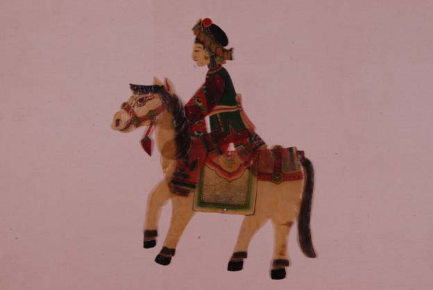 海寧皮影戲也稱蠶花戲,是浙北蠶俗在民間藝術(shù)的體現(xiàn),這種古老的劇種在海寧、桐鄉(xiāng)、海鹽等地很多村莊,每年清明節(jié)前后或收繭后,必演。多由全村集資雇請羊皮戲藝人來村演皮影戲,老幼聚集觀看。演完整本羊皮戲后必加演一段《馬鳴王菩薩》,皮影戲紙幕上出現(xiàn)一個女子騎在馬上奔馳,藝人則伴唱《馬鳴王菩薩》。演畢,蠶農(nóng)向藝人討取做紙幕的綿紙稱“蠶花紙”,用以糊蠶匾,謂可致豐收,然而目前此類戲已瀕臨危機,《馬鳴王菩薩》更是少有人表演。 這類海寧皮影戲的人像以羊皮或牛皮為材料,通過繪圖、剪形、勾線、上色、縫制、插簽等工序制成,以重彩繪、近實像、單眼側(cè)面、并足側(cè)身為主要特點。此套皮影戲牛皮道具為《馬鳴王菩薩》所使用,共有五件:馬及三姐妹
