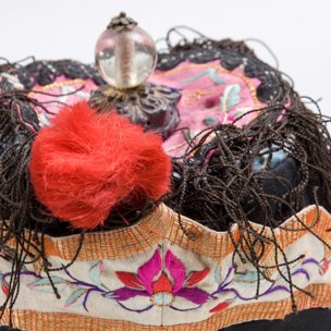 石青緞平金繡花蝶童帽