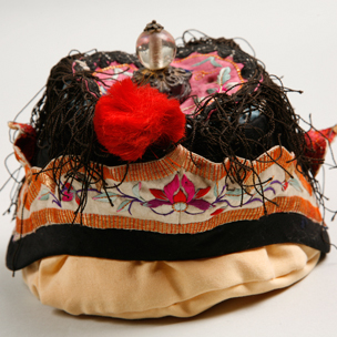 石青緞平金繡花蝶童帽
