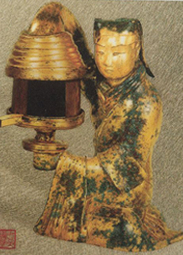 Featuring one of China's cultural treasures, this embroidery depicts an imperial lantern from the Changxin Palace,seen here held by a courtesan in a well-designed composition. Discovered from the Western Han dynasty tomb of Duchess Dou Wan, wife of Duke Liu Sheng of Zhongshan, the lantern is exquisitely worked in free satin stitch to such minute details as to show the patina of the bronze. (XZ)