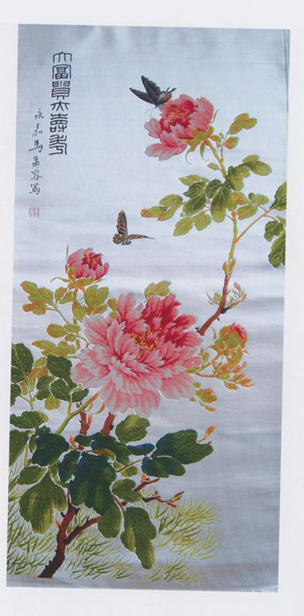 This polychrome silk woven picture is manufactured by the DouJin Sheng Silk Weaving Manufacture in Hangzhou. The warp threads are all in one color while the weft threads are in several colors.Predominant in the center is a peony with two green birds on it, a combinationmeant to wish somebody longevity. (XZ)