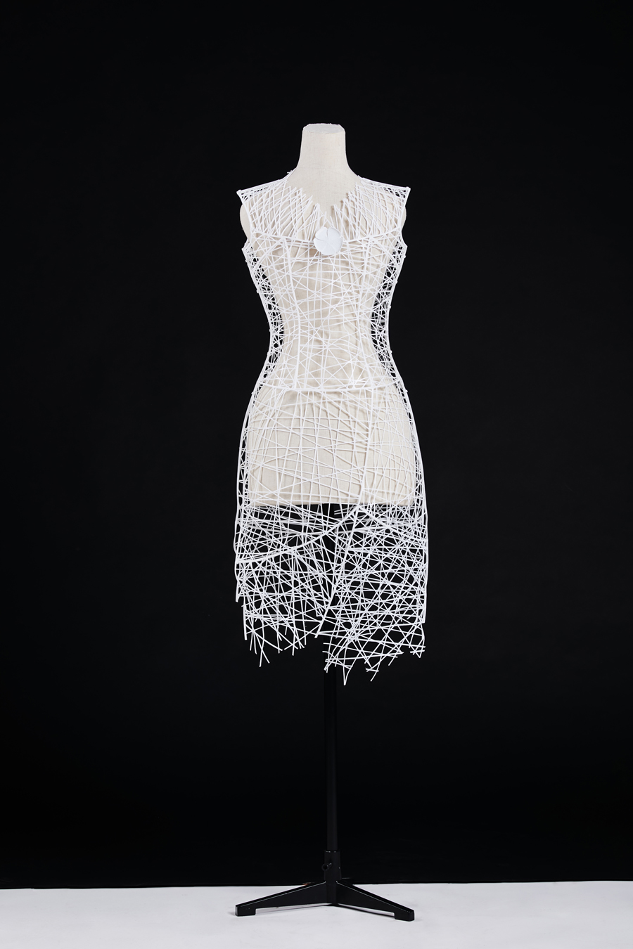 本創(chuàng)作的靈感來源取自宋代王安石的《梅花》。整體設(shè)計以抽象幾何分切的塊面,輔以具象的梅花裝飾進(jìn)行點綴,形塑出那些處于艱難的環(huán)境中依然能堅守操守而不畏打擊的人。設(shè)計元素以縱橫交錯的粗細(xì)線條,透過分切的手法來展現(xiàn)線條與人體之間的光影變化,再搭配具象但帶有些微粗糙雪花質(zhì)感的梅花裝飾,營造出高風(fēng)亮節(jié)之人即使處在艱困的環(huán)境中,仍能堅守自我的高潔品格。