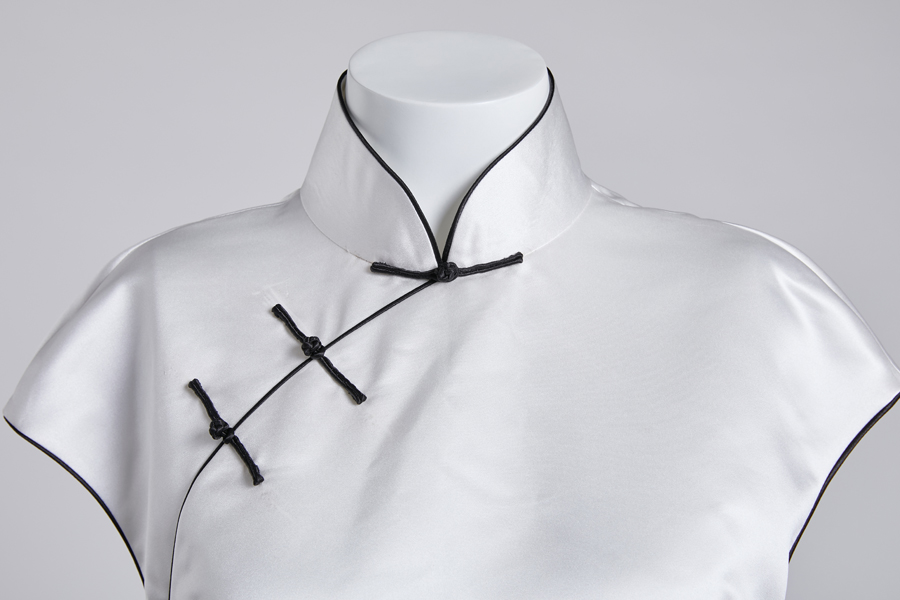 詩(shī)意雖自在,但仍有要遵循的平仄對(duì)仗。正如這外層框架為經(jīng)典的旗袍樣式,白色的主色配以高對(duì)比的黑色緄邊,寓為詩(shī)的規(guī)矩。下身大擺紗裙從單邊開權(quán)中展露出來,就像詩(shī)詞工整的字里行間透露出的無邊詩(shī)意。多層半透明紗質(zhì)結(jié)構(gòu)配以漸短的不規(guī)則下擺處理, 如同喻景詩(shī)所描繪的寫意山水畫裝點(diǎn)著整件旗袍。 整體設(shè)計(jì)的大部分留白正應(yīng)著“言有盡而意無窮”的中國(guó)古典詩(shī)歌美學(xué)。