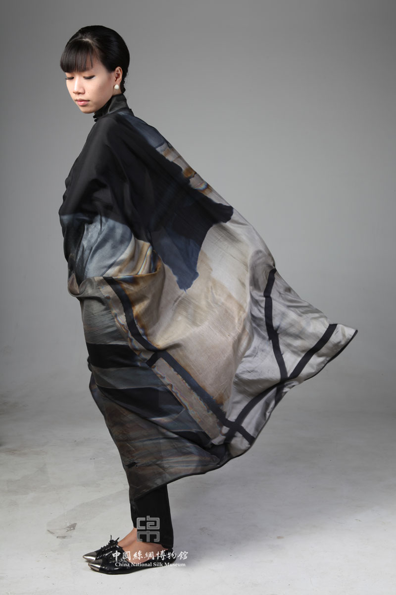 設(shè)計(jì)說明:這件旗袍共250克重,換算成中國(guó)計(jì)量單位為5兩,于是起名為“四兩十錢”。設(shè)計(jì)靈感采用旗袍——中國(guó)近代最具凝結(jié)力的一種時(shí)裝樣式,它是古今中國(guó)服裝樣式的經(jīng)典承接,奠定了中國(guó)現(xiàn)代女裝形態(tài)審美基礎(chǔ)。此作品一方面注重刻繪旗袍的文化氣質(zhì):含蓄優(yōu)雅、安靜大方;另一方面強(qiáng)調(diào)一種混合的民族感,它有古希臘托加式的浪褶,中世紀(jì)歐洲騎士的披風(fēng),換一種穿法,又變成了伊斯蘭教或基督教中的圣女。