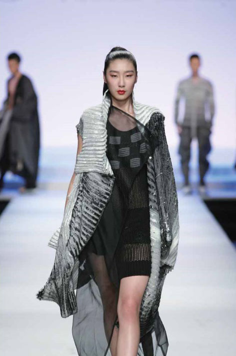 設計理念:陰霾的冬季里灰蒙蒙的村莊,貌似破舊的村莊在慢慢消亡,其實是在無聲的抵抗、慢慢的生長蔓延,以一種順從的姿態(tài)來抵抗外在施加的壓力。作品以針織為媒介,針織柔軟卻有張力,通過其材料紋理的變化來體現(xiàn)微妙的情緒和解構分割,呈現(xiàn)出很多交錯的空間效果。針織和真絲綃以及羊毛混搭有沖突、有交融,都在隱約表達著一種沖突和相處狀態(tài),劣跡斑斑其實是另一個角度的新生和希望。(圖片由設計師提供)