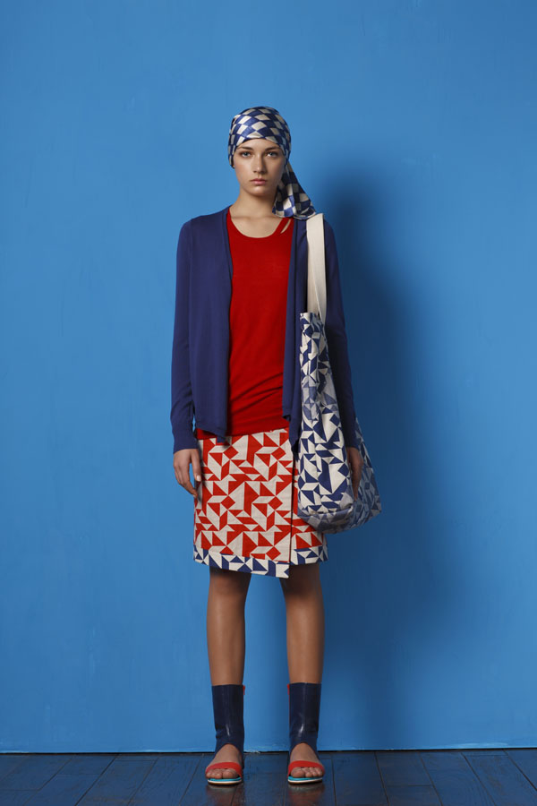 設(shè)計(jì)特點(diǎn):小A造型的及膝裙,具有很好的包容性,能夠修飾臀部的線條。面料手感厚實(shí)舒適,風(fēng)格強(qiáng)烈,使得服裝具有挺括的廓形感。色彩上采用幾何拼色的設(shè)計(jì),在撞色拼接設(shè)計(jì)中體現(xiàn)服裝的質(zhì)感和流行度。