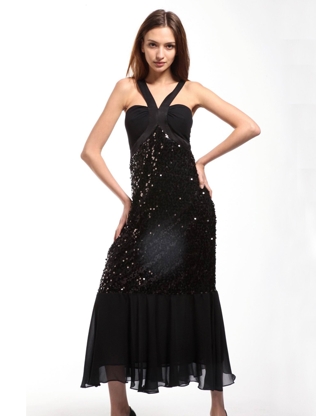 設(shè)計(jì)理念:該作品在黑色真絲上綴滿繡片,精致靈動,如黑夜星空中的星辰般充滿魅力。服裝剪裁合體,充分展現(xiàn)女性的優(yōu)雅與柔美。
