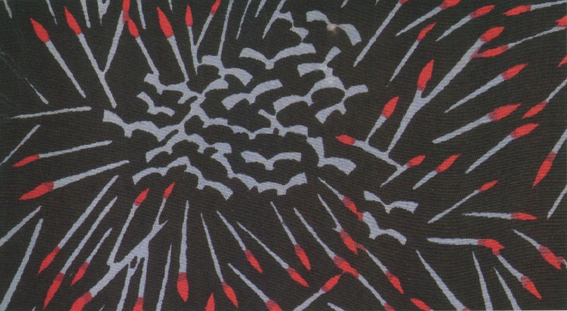 這是一個(gè)文化大革命進(jìn)入如火如荼的階段,強(qiáng)調(diào)“革命現(xiàn)實(shí)主義風(fēng)格”,出現(xiàn)了大量所謂“革命現(xiàn)實(shí)”題材。該印花綢采用了“批判《論共產(chǎn)黨員的修養(yǎng)》”這一當(dāng)時(shí)的革命題材,具有鮮明的時(shí)代特色?!墩摴伯a(chǎn)黨員的修養(yǎng)》于1939年8月在延安的《解放》雜志上連載,是劉少奇論述共產(chǎn)黨員鍛煉和修養(yǎng)的著作。文革中此書被列為劉少奇修正主義的代表作,在全國范圍內(nèi)收到了批評(píng)。印花綢采用黑底,其上以抽象的書本象征該著作,書本四周是紅頭毛筆,批判之意顯而易見。