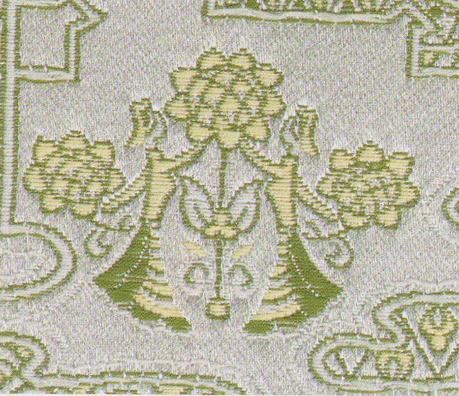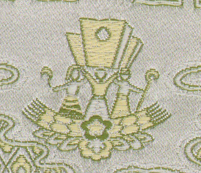 這是一個文化大革命進(jìn)入如火如荼的階段,強(qiáng)調(diào)“革命現(xiàn)實主義風(fēng)格”,出現(xiàn)了大量所謂“革命現(xiàn)實”題材。該織錦緞采用了“工農(nóng)兵”這一革命題材。工農(nóng)兵是工人、農(nóng)民和士兵三個詞的合稱,在上世紀(jì)五十到七十年代的多次政治運(yùn)動中,這三個階級被認(rèn)為是最徹底的無產(chǎn)階級,也是社會主義國家最具有革命先進(jìn)性的階層。在政治運(yùn)動的宣傳中作為正面褒揚(yáng)的角色出現(xiàn),和地富反壞右作為對立??楀\緞中有握槍站崗的士兵,高舉紅寶書的工人,還有簇?fù)硐蛉湛霓r(nóng)民。紅寶書、向日葵在這里都有了特別的含義。