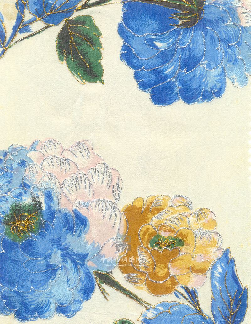 該織物在印花的基礎(chǔ)上,根據(jù)花瓣、花葉再盤銀繡。
