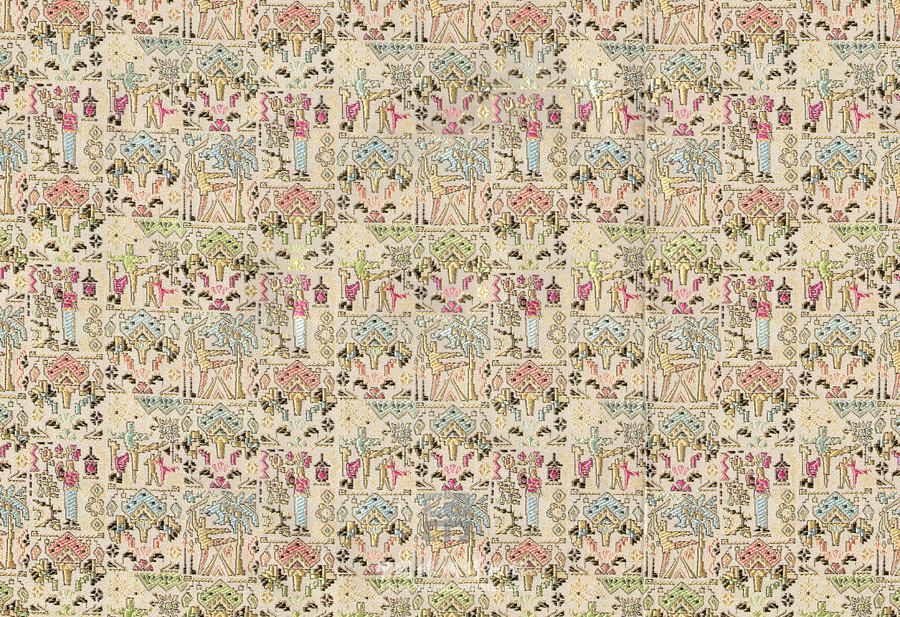 “樣板戲”一詞源于《人民日報(bào)》1967年的評論《革命文藝的優(yōu)秀樣板》,是文革中的一個(gè)特殊用語,有京劇《紅燈記》、《沙家浜》、《智取威虎山》、《海港》、《奇襲白虎團(tuán)》,芭蕾舞劇《紅色娘子軍》、《白毛女》和交響音樂《沙家浜》等八部代表作品。該織錦緞形象的表現(xiàn)了芭蕾舞劇《白毛女》、《紅色娘子軍》以及京劇《紅燈記》。