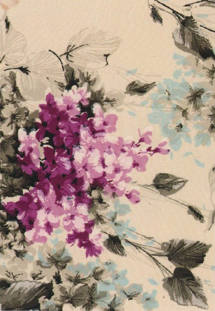 自然界中的花草動(dòng)物、建筑風(fēng)景都是絲綢設(shè)計(jì)中最多表現(xiàn)的題材,一物一式,各顯其美,其中又以花卉紋樣最受青睞。于舒展飄逸、精致典雅間變化無(wú)窮。通過(guò)它們,我們可以清晰的感受到設(shè)計(jì)師的一種創(chuàng)作理念,那就是表現(xiàn)自然,感悟自然。該印花雙縐,配色典雅,春夏氣息濃重。雙縐是一種薄型縐類絲織物。