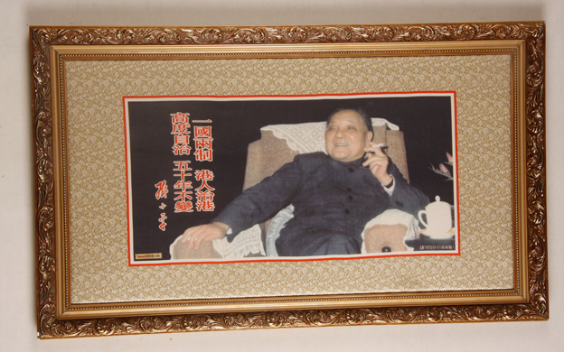 描述:該絲綢畫織的是偉人鄧小平像。表現(xiàn)鄧小平悠閑的坐在沙發(fā)上談笑風聲的情形。并織有“一國兩制,港人治港,高度自治,五十年不變”這段名言。由杭州凱地絲綢有限公司展覽后贈送。