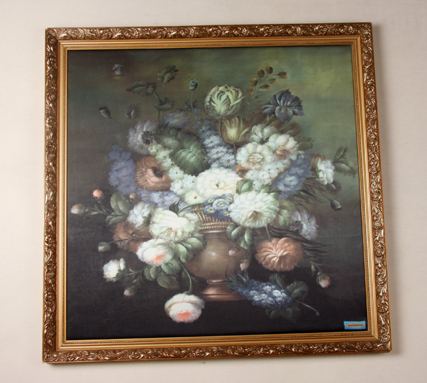 描述:此是一幅絲綢彩印畫,呈正方形,保存完好,色彩豐富,已用鏡框裝裱,表現(xiàn)了一插于花瓶中的花束,十分逼真,極具油畫效果。由杭州凱地絲綢有限公司展覽后贈(zèng)送。