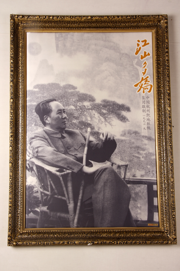 描述:該絲綢畫織的是偉人毛澤東像。表現(xiàn)毛主席坐在椅子上眺望遠(yuǎn)方,似要指點(diǎn)江山的情形。并織有“江山多嬌”四字。由杭州凱地絲綢有限公司展覽后贈送。