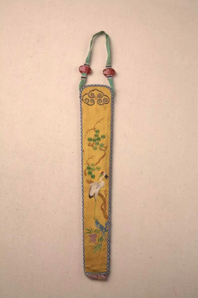 黃緞地彩繡松齡鶴壽扇套,晚清,中國絲綢博物館藏